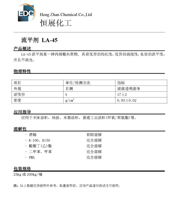 LA-45流平劑是一種丙烯酸共聚物, 具有優(yōu)異的均化性,優(yōu)異的消泡性,良好的流平性,并且不消光。