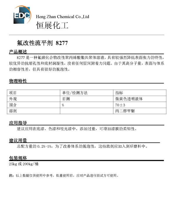 8277是一種氟碳化合物改性聚丙烯酸酯共聚體溶液。具有較強(qiáng)烈降低表面張力的特性,較優(yōu)異的抗縮孔性和底材潤濕性,沒有任何層間附著力問題。由于其高分子量,表面與體系的相容性差,但具有很好的脫泡性。